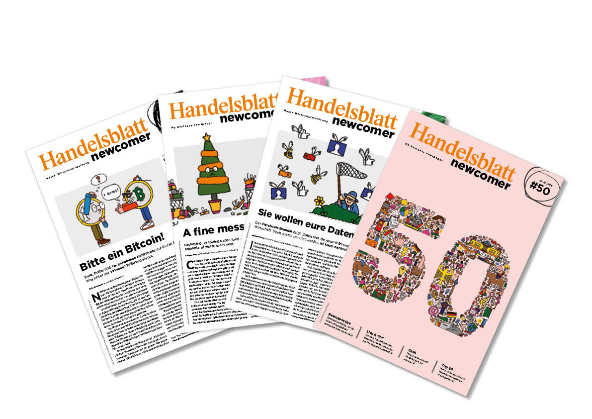 Redesign of the newspaper format “Handelsblatt Newcomer” to promote economic education among schoolchildren. Art direction for several issues. Cover illustration: David Biskup; graphics: Sandra Jazno